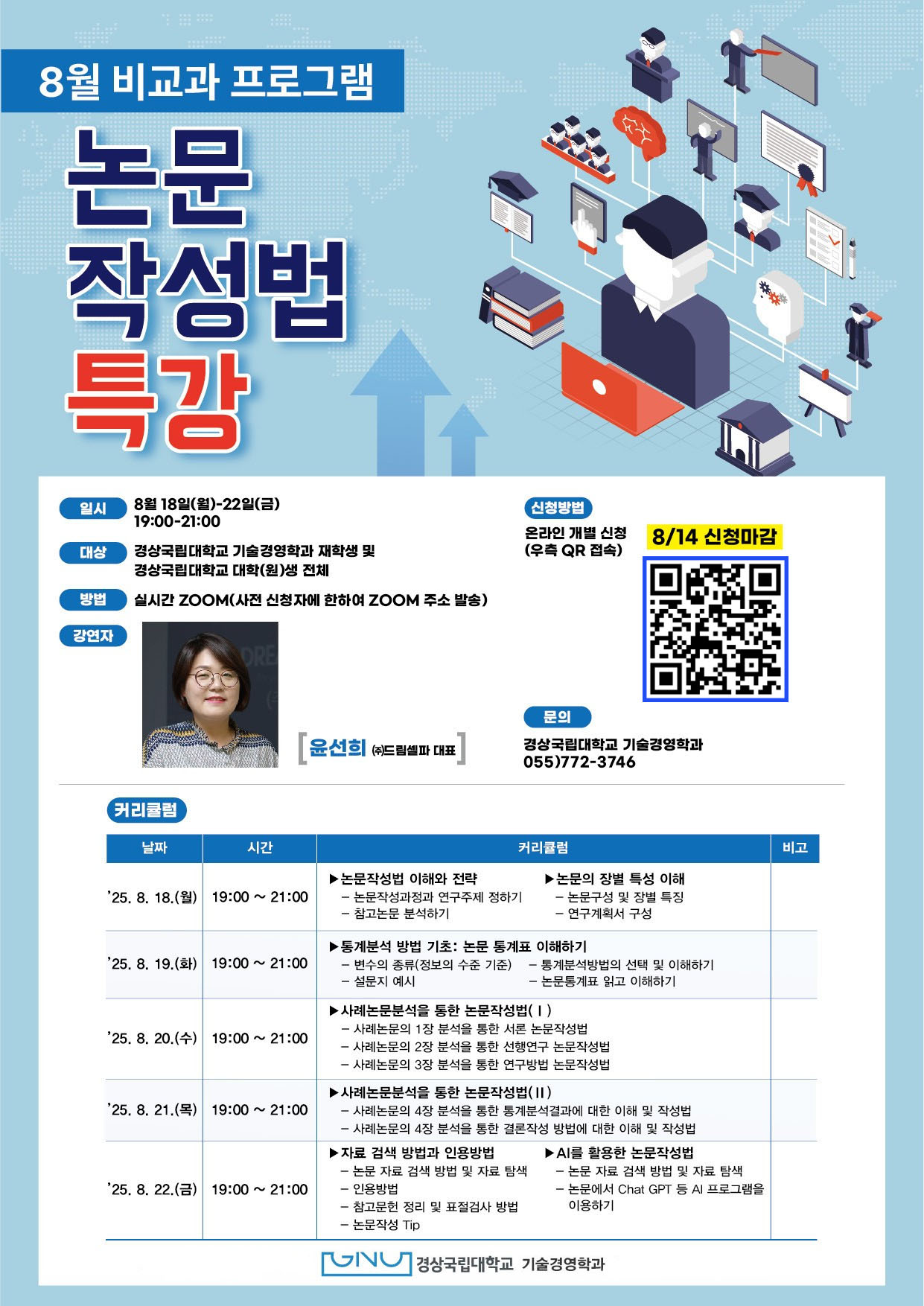 경상국립대학교에서 2025년도 하계 비교과프로그램 논문작성법 특강을 비대면으로 진행하오니 많은 관심 부탁드립니다. ■ 강의일시: 2025.8.18.(월)-22.(금) ■ 강의방법: 비대면 (신청자에한해 ZOOM링크 문자발송) ■ 신청방법: 포스터내 QR코드 접속(구글폼 https://forms.gle/VzmGMk2AU8BQHPREA) ■ 신청기한: ~8.14(목) ■ 강 연 자 : 윤선희 대표 ((주)드림셀파) ■ 문의: 경상국립대 과학기술정책학과 055-772-3749 감사합니다. |
