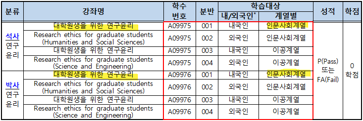 ☆ 대학원 공통 교과목 이수(석·박사연구윤리)_필수 ☆인문사회계열☆ 2017학년도 이후 입학생부터는 석사과정 학생은「석사연구윤리」를 박사과정학생은「박사연구윤리」를 이수하여야 수료(졸업)이 가능하므로, 수강신청기간에 해당 과목을 수강신청하고 개강일 이후 온라인교육을 이수완료 하여야 학점인정이 가능 ※ 연구윤리 수강 인정 강좌